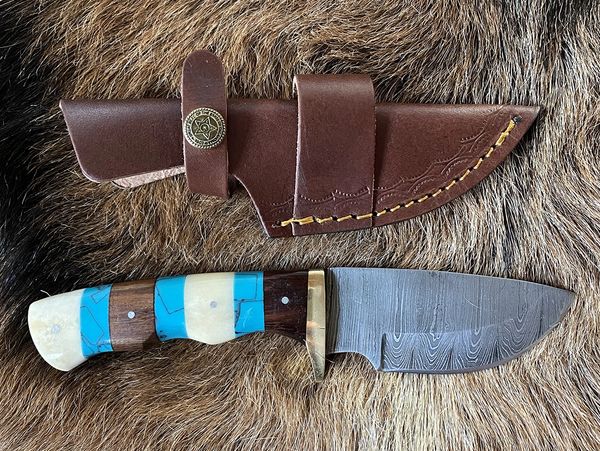 Beautiful hunting knife with handcrafted 3.625" Damascus steel fixed blade, resin and solid wood handle with steel pins and brass finger guard. Overall knife length is 8". Ships in a genuine leather sheath. Perfect for hunting, camping, fishing and skinning. All knives and leather sheaths are individually made by master craftsmen from around the world.